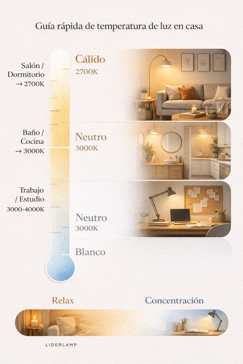 - Zonas de uso diario como baño o cocina → 3000K